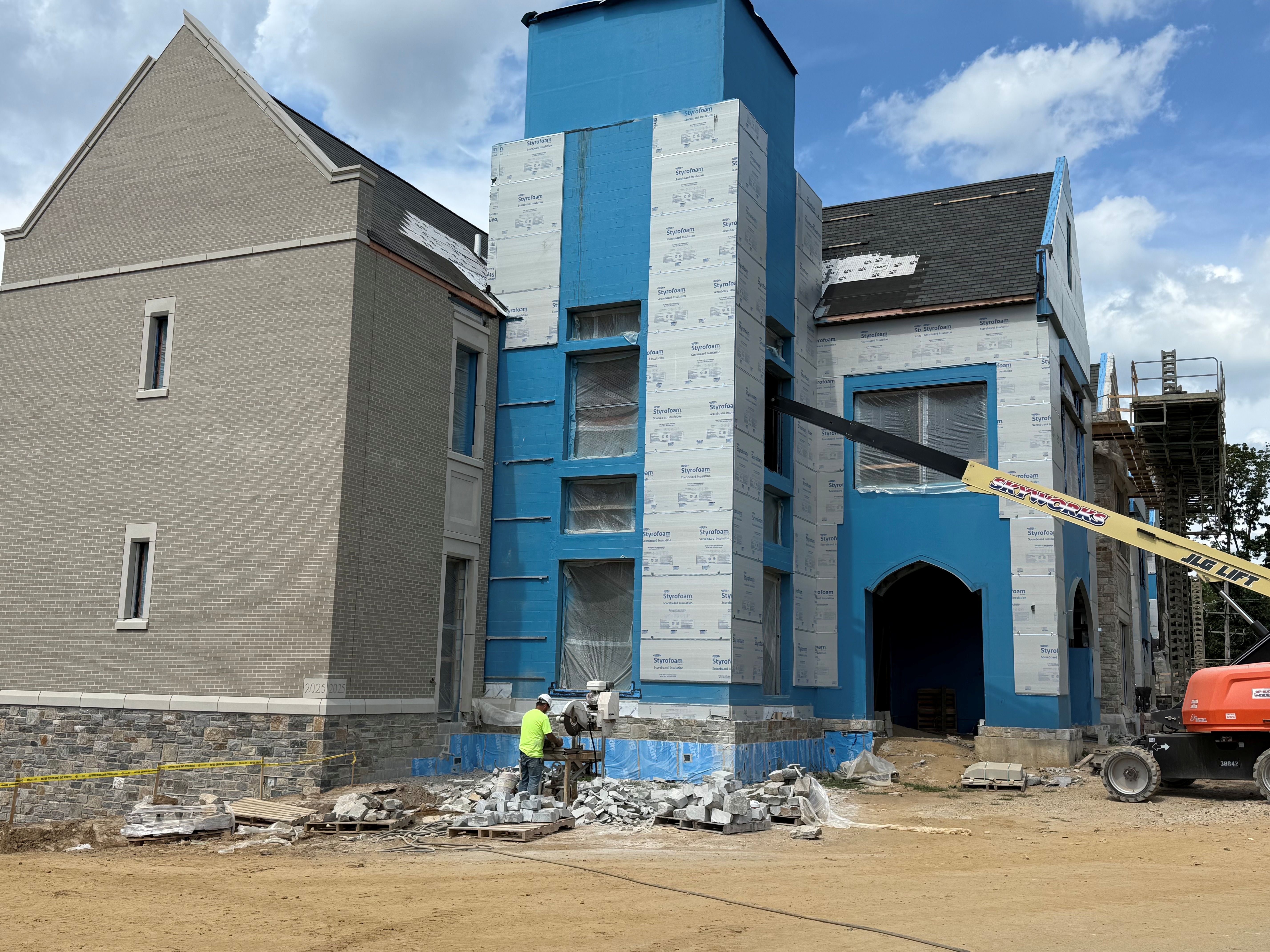 July 21, 2025: The roof shingles are installed on about half of the roof. Crews are adding stonework and brick work on all sides, and will begin closing up walls this week. The electrical work, plumbing, and heating, ventilation, and air conditioning continue on all three floors of the building.