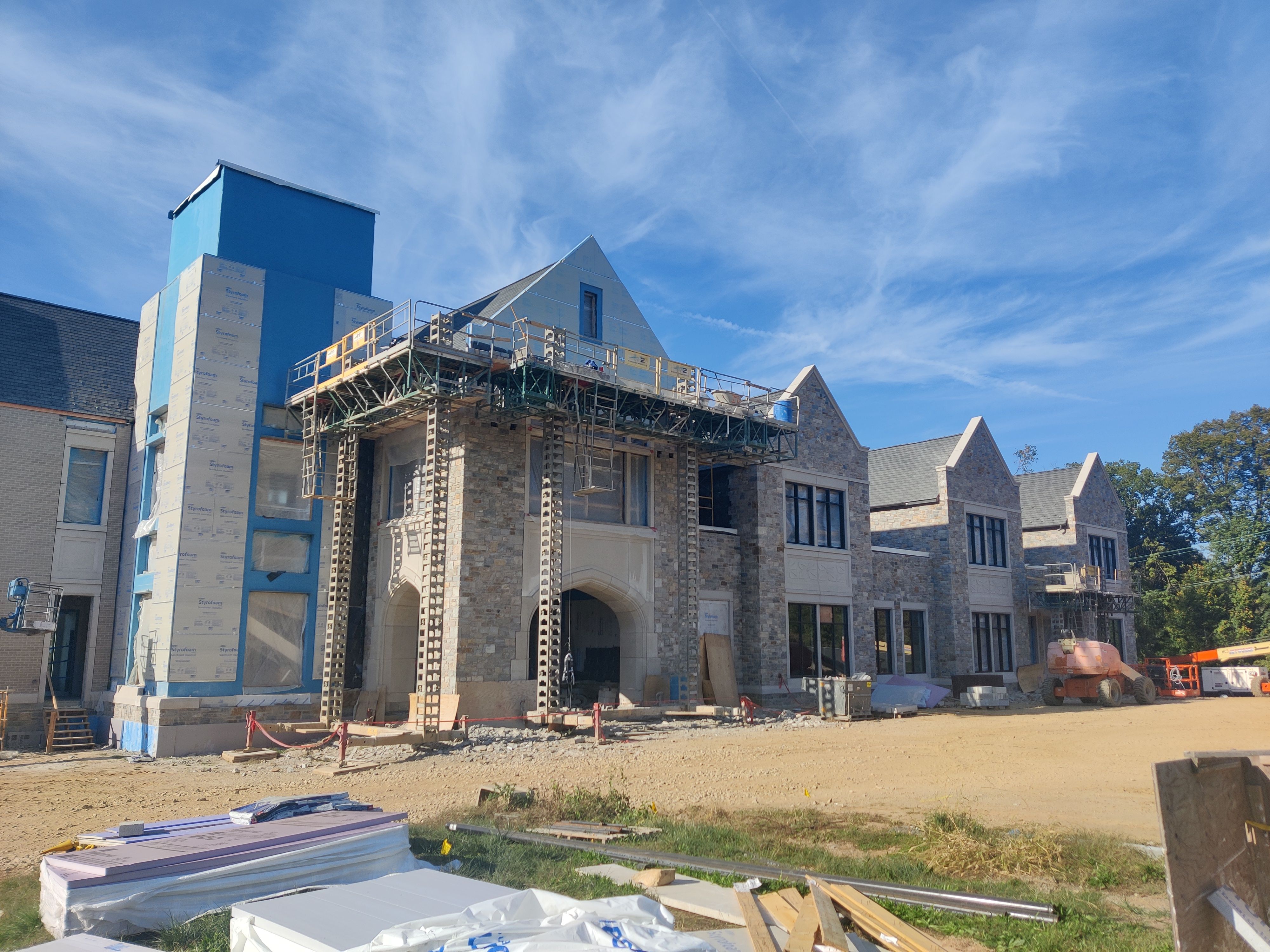 October 6, 2025: On the exterior: crews are installing windows, and stonework is about 75 percent finished. On the interior: the bathrooms are coming together, and the elevator has arrived and is waiting to be installed.